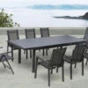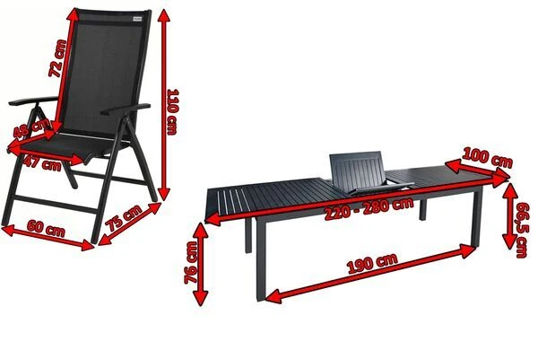 Die Esstischgruppe besteht aus einem Ausziehtisch und acht Multipositionssesseln. Das Gestell vom Tisch, sowie die der Sessel wurden aus Aluminium mit einer Pulverbeschichtung in der Farbe anthrazit angefertigt. Die Tischplatte wurde ebenfalls aus Aluminium mit einer schwarzen Pulverbeschichtung angefertigt. Aluminium eignet sich dank zahlreicher positiver Eigenschaften ideal für die Herstellung von Outdoor-Möbeln. Sie können die Esstischgruppe unbesorgt das ganze Jahr im Freien stehen lassen. Durch die Pulverbeschichtung wird das Material stoß-, schlag- und kratzfest. Die Sessel sind mit einer Bespannung aus Textilene in der Farbe schwarz ausgestattet. Das Kunststoffgewebe zeichnet sich durch eine hohe Belastbarkeit von bis zu ca. 100 kg aus. Zudem ist das Gewebe schnelltrocknend und pflegeleicht sowie frost- und hitzebeständig.
