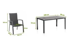 Der rechteckige Tisch für 4-6 Personen bietet Platz für eine ganze Familie. Die anthrazitfarbene Tischplatte besteht aus hochwertig verarbeitetem Kettalit und wird von einem soliden Gestell aus Aluminium in anthrazit getragen. Die positiven Eigenschaften von Aluminium sind zahlreich: Es ist leicht, wetterfest, stabil und elegant. In Kombination mit der Stabilität und der kratzfesten Oberfläche der Kettalit Tischplatte wird aus diesem Möbelstück das Highlight für Ihren Garten. Mit dem Stapelsessel aus der Legato Curve Serie mit den Maßen von ca. 68 x 65,5 x 101 cm bequem durch den Sommer. Das solide und formschöne Gestell besteht aus edlem, anthrazitfarbenen Aluminium. Die ebenfalls anthrazite Sitzfläche wird aus wasserdurchlässigem, hochwertigem Outdoorgewebe gefertigt. Die Sitzfläche nimmt kein Wasser auf und trocknet schnell, so können Sie auch nach einem kleinen Regenschauer rasch wieder Platz nehmen. Das luftige Gewebe ist formstabil und trotzdem sehr bequem und zusätzlich UV- und sonnenölbeständig – insgesamt also der perfekte Begleiter in Ihrem Garten. Die Sessel lassen sich aufstapeln – wenn sie nicht benötigt werden können Sie sie platzsparend verstauen.