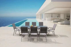 9-teilige Sitzgruppe mit KETTLER Stapelsesseln und OUTFLEXX Premium Ausziehtisch, aus Aluminium/Textilene/Sicherheitsglas in silber, für 8 Personen