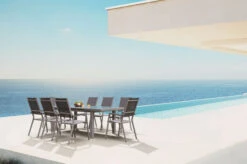 9-teilige Sitzgruppe mit KETTLER Stapelsesseln und OUTFLEXX Premium Ausziehtisch, aus Aluminium/Textilene/Sicherheitsglas in silber, für 8 Personen