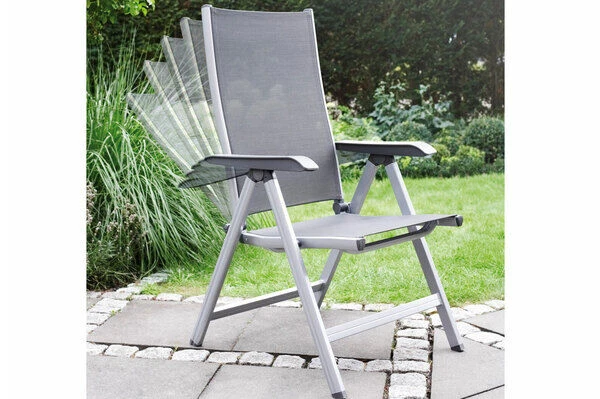 Mit den passenden Multipositionssesseln aus der Basic Plus Serie kommen Sie so bequem durch den Sommer. Mittels Rasterschiene lässt sich der Sessel leicht in 4 verschiedene Positionen bringen – so wird der Komfort eines Liegestuhls direkt integriert. Das solide und formschöne Gestell besteht aus edlem, silberfarbenem Aluminium. Die anthrazitfarbene Sitzfläche wird aus wasserdurchlässigem, hochwertigem Outdoorgewebe gefertigt. Die Sitzfläche nimmt kein Wasser auf und trocknet schnell, so können Sie auch nach einem kleinen Regenschauer rasch wieder Platz nehmen. Das luftige Gewebe ist formstabil und trotzdem sehr bequem und zusätzlich UV- und sonnenölbeständig – insgesamt also der perfekte Begleiter in Ihrem Garten. Dank der leichten Materialien und des Klappmechanismus lässt sich der Stuhl leicht zu handhaben – wenn er nicht benötigt wird können Sie ihn platzsparend verstauen.