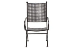 Die zeitlose Form, robust und filigran zugleich, kombiniert die hohen Ansprüche moderner Möbel mit klassischem Design. Zu den prägenden Elementen der Romeo-Serie zählen unter anderem die geschwungene Konstruktion und die gelochten Sitz- und Liegeflächen. Verspielte Details wie die abgerundeten Armlehnen und die Zierkugeln an der Rückenlehne machen den Sessel zu einem echten Blickfang. Das aufwendig von Hand geschmiedete Eisengestell zeichnet sich durch seine hohe Stabilität und Haltbarkeit aus und kann mit bis zu ca. 110 kg belastet werden. Es wurde in einem aufwendigen Verfahren verzinkt und anschließend in Marone pulverbeschichtet. Dadurch ist der Gartensessel gegen äußere Witterungseinflüsse optimal geschützt und eignet sich perfekt für den Outdooreinsatz.