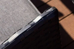 Das Untergestell des Möbelstücks besteht aus Aluminium, dies macht es nicht nur stabil, sondern sorgt auch dafür, dass es sich aufgrund des relativ geringen Gewichts ganz leicht hin und her stellen lässt. Dazu sorgt die Pulverbeschichtung auf dem Aluminium für eine verbesserte Korrosionsbeständigkeit. Das Aluminiumgestell wird mit Polyrattangeflecht bespannt. Aufgrund der enormen Wetterbeständigkeit von Polyrattan können Sie diese Diningsessel ohne Bedenken nach Abnahme der Polster das ganze Jahr über im Freien stehen lassen. Das flache Geflecht ist in der Farbe braun (Faser w3) gehalten und integriert sich so mühelos in alle Terrasseneinrichtungen! Gemütliche Sitz- und Rückenpolster (100 % Olefin (200 g/m³)) mit einer Stärke von ca. 5 cm sorgen für höchsten Sitzkomfort. Farblich sind die grau melierten Polster perfekt auf das Geflecht abgestimmt. Die synthetische Faser Olefin wird für ihre Hitzebeständigkeit und optimalen Trage- und Pflegeeigenschaften geschätzt. Sollten Sie einmal Falten in Ihren Polstern haben, werden diese bei Wärme von alleine verschwinden, sodass die Bezüge komplett bügelfrei sind. Textilien aus Olefin sind bequem, hautkühlend, waschbar und bügelfrei. Sie eignen sich perfekt für den Einsatz im Freien, was nicht zuletzt an ihrer wasserabweisenden und atmungsaktiven Materialzusammensetzung liegt.