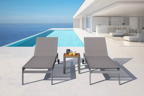 Wenn Sie bei Ihren Gartenmöbeln Wert auf edles Design, Komfort und hochwertige Materialien legen, dann sind Sie hier genau richtig. Dieses Sonnenliegenset von OUTFLEXX® besteht aus zwei Gartenliegen mit einer Textilenbespannung in der Farbe taupe und einem Beistelltisch aus Edelstahl und Teakholz mit den ca Maßen von 45 x 45 cm.