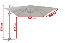 Der rechteckige Sonnenschirm von OUTFLEXX® besticht durch seine hochwertig verarbeiteten Materialien und seine praktischen Funktionen. Das ca. 400 x 300 cm große Schirmtuch besteht aus 100% Polyester (ca. 250 g/m²) und ist wasserabweisend imprägniert. Das besondere Gestell besteht aus pulverbeschichtetem Aluminium in Holzoptik und hat dabei eine Haupt-Rohrdicke von ca. 95 x 65 mm. Der Ampelschirm besitzt keinen Mittelmast und bietet daher eine praktische Lösung, um ohne Probleme eine komplette Sitzgruppe zu beschatten. Die großzügige Durchgangshöhe von ca. 210 cm schränkt die Nutzung Ihrer Terrasse in keinster Weise ein. Durch einen hohen UV-Schutz von 80+ spendet der Sonnenschirm dabei extra viel Schatten. Die Beschattung bei unterschiedlicher Sonneneinstrahlung ist mit diesem praktischen Ampelschirm problemlos möglich und dank eines leichtgängigen Kurbelmechanismus lässt er sich kinderleicht aufspannen. Diese Kurbel können Sie in den unteren Teil des Schirmstocks umstecken und so den Schirm um 360 ° drehen. Das integrierte Air-Vent System lässt auch bei sehr warmen Klima die Luft zirkulieren und verhindert ein Umkippen auch bei stärkeren Windböen. Das Air-Vent System sorgt außerdem dafür, dass der Wind nach oben entweichen kann und den Schirm dabei nicht anhebt. Die 8 eingebauten Dachstreben mit den Maßen von ca. 17 x 25 mm sorgen zusätzlich für weitere Standfestigkeit. Im Lieferumfang ist ein Plattenständer für Wegplatten enthalten. Um einen sicheren Stand zu gewährleisten, empfehlen wir Ihnen den ca. 28 kg schweren Ampelschirm mit ca. 80 kg Wegplatten zu beschweren. Bitte beachten Sie, dass die Platten NICHT mit im Lieferumfang enthalten sind.