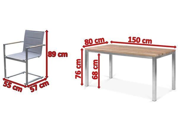Wenn Sie sich jetzt angesprochen fühlen, sollten Sie sich diese Esstischgarnitur noch genauer anschauen. Das Set besteht aus einem Esstisch mit den Maßen von ca. 150 x 80 x 76 cm und 6 extra gepolsterten Stapelsesseln aus einer Teak/Edelstahl Kombination mit einer Textilenbespannung in der Farbe Silber.