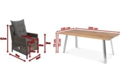 Das verwendete recycelte Teakholz verleiht dem Tisch einen ganz besonderen Charme. Die rustikal gebürstete Oberfläche sorgt dafür, dass die natürliche Struktur des Holzes erhalten bleibt und die Maserung besonders gut zum Vorschein kommt. Das Zusammenspiel aus dieser rustikalen Oberfläche und dem edlen 304er Edelstahl, verleiht dem Tisch sein besonderes Aussehen und sorgt dafür, dass er perfekt zu den Polyrattan-Sesseln passt. Mit den Maßen von ca. 200 x 100 x 76 cm bietet er ausreichend Platz für 6-8 Personen. Die Stärke der Tischplatte von ca. 4 cm und das besonders geformte Tischgestell unterstreichen das Zusammenspiel aus rustikalen und edlen Elementen zusätzlich.
