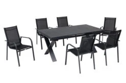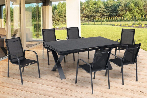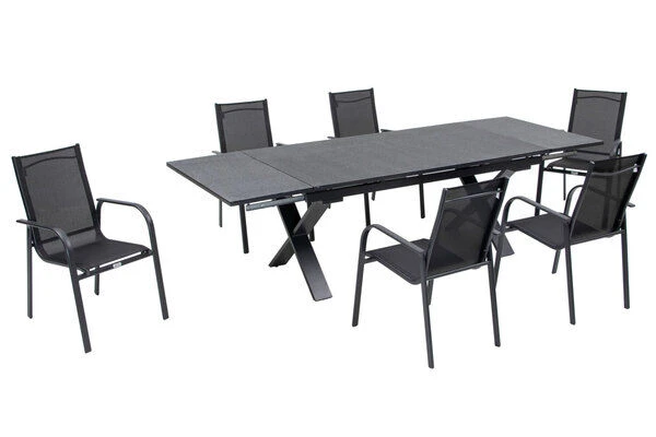 OUTFLEXX® Esstischgarnitur mit Ausziehtisch 180/280x100cm und Stapelsesseln aus Aluminium/Textilene in schwarz, für 6 Personen