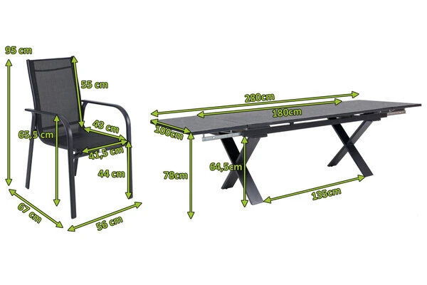 Das Set besteht aus einem Esstisch und 6 dazu harmonierenden Stapelsesseln. Sein modernes Flair fügt sich sowohl im Garten als auch im Haus perfekt ein. Die Sessel sind luftig leicht und doch stabil. Für das solide Gestell kommt korrosionsbeständiges Aluminium zum Einsatz. Die schwungvollen, designstarken Armlehnen sorgen für zusätzlichen Komfort. Bespannt werden die durchgehenden Rücken- und Sitzflächen mit Textilene im passenden Schwarzton. Es ist unglaublich hautsympathisch und sorgt für ein herrliches Sitzgefühl, das Sie auch in der Sommerhitze nicht im Stich lässt. Die Gesamtmaße liegen jeweils bei ca. 67 x 56 x 95 cm. Mit einer Sitzbreite von ca. 41,5 cm und einer Sitztiefe von ca. 43 cm sitzen Sie stets bequem. Dank des schlanken Designs und geringen Gewichtes von ca. 2,8 kg lassen sich die Leichtgewichte auch prima transportieren, stapeln und platzsparend verstauen. Freuen Sie sich darauf nach einem leckeren gemeinsamen Essen oder bei einem Spieleabend den Alltag in weite Ferne rücken zu lassen.
