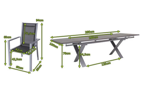 Erleben Sie luftig leichtes Outdoor-Dining und verwandeln Sie Ihre Terrasse in einen charmanten Wohnbereich im Freien. Mit der Esstischgruppe von OUTFLEXXÂź erhalten Sie hochwertige QualitĂ€t, erstklassigen Komfort und schickes Design. Das Set besteht aus einem eleganten Ausziehtisch mit MaĂen von ca. 180/280 x 100 x 78 cm und 8 Stapelsesseln und wird auch gehobenen AnsprĂŒchen gerecht.
