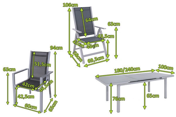 GenieĂen Sie die charmante Tischgruppe und verbringen Sie schöne Momente im Kreise Ihrer Lieben auf der Terrasse oder im Garten. In den Sitzmöbeln lĂ€sst es sich herrlich Entschleunigen und sie bestechen durch ihren modernen Look. Dank der bequemen Sitz- und RĂŒckenflĂ€che erhalten Sie einen angenehmen Sitzkomfort, der Sie und Ihre Lieben begeistern wird. Die MaĂe der Multipositionssessel liegen bei ca. 69,5 x 58 x 106 cm und die MaĂe der Stapelsessel bei ca. 65 x 60 x 94 cm und mit dem geringen Gewicht von ca. 9 kg bzw. 3,3 kg können Sie die Sitzmöbel auch schnell an Ihren LieblingsplĂ€tzen im Garten, auf der Terrasse oder dem Balkon platzieren. Dank der hochwertigen Materialien und erstklassigen Verarbeitung sind die Sessel bis zu ca. 120 kg belastbar. Ihr Komfort steht jedoch an erster Stelle! Die groĂzĂŒgige RĂŒckenlehne der Multipositionssessel lĂ€sst sich ganz leicht 7-fach verstellen und ermöglicht Ihnen somit ein individuelles SitzgefĂŒhl und vollste Entschleunigung. So können Sie spielend von einer Liege- in eine Sitzposition und wieder zurĂŒck wechseln, ganz nach Bedarf. Diese FlexibilitĂ€t gepaart mit dem gehobenen Sitzgenuss machen den leichten Klappsessel zum perfekten Begleiter. FĂŒr das schicke und solide Gestell der Sessel kommt korrosionsbestĂ€ndiges Aluminium mit Pulverbeschichtung im glanzvollen Silberton zum Einsatz. Bespannt werden sie mit dem hochwertigen Outdoorgewebe Textilene im passenden Grauton. Das luftige Gewebe sorgt fĂŒr ein herrlich leichtes SitzgefĂŒhl, das seinesgleichen sucht. Die Sitz- und RĂŒckenflĂ€che ist darĂŒber hinaus unglaublich hautsympathisch, UV-bestĂ€ndig und verliert nie ihre Form. Das Material trocknet auch so schnell, dass Sie sich nach einem kurzen Regenschauer rasch wieder hinsetzen können. Erhöhten Komfort bieten die schlichten und zugleich markanten Armlehnen aus Aluminium, die auch optisch ĂŒberzeugen. Mit Hilfe der Stapel- bzw. Klappfunktion lassen sich die Sessel auch einfach platzsparend verstauen.