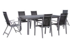 7-teilige Tischgruppe mit OUTFLEXXÂź Multipositions-/Stapelsessel und Premium Ausziehtisch aus Aluminium/Textilene/Sicherheitsglas in silber/grau, fĂŒr 6 Personen