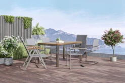 Das verwendete Teakholz ist FSC-zertifiziert und stammt damit aus verantwortungsvollen Quellen. So können Sie sich guten Gewissens zurücklehnen und sich so richtig entspannen. Teakholz und Edelstahl sind besonders witterungsbeständig und halten sowohl Frost und Hitze als auch Feuchtigkeit und Regen aus. Teakholz hat aufgrund des hohen Anteils an holzeigenen Ölen einen natürlichen Schutz gegen Pilze und Schädlinge. So beschränkt sich die Pflege Ihrer neuen Gartenmöbel auf ein Minimum und Sie können Ihre Zeit im Garten mit angenehmen Tätigkeiten verbringen.
