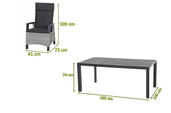 | Hohe Qualität Das verwendete Aluminium wurde durch eine anthrazitfarbene Pulverbeschichtung veredelt und die Keramik Tischplatte zeichnet sich durch seine robusten Materialeigenschaften aus. Dank dieser Materialkombination sind die Möbel weitestgehend witterungsbeständig und außerdem lichtecht und äußerst pflegeleicht. |