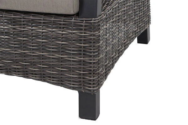 | Stabiles Polyrattan-Geflecht Das halbrunde Polyrattan-Geflecht GARDINO® in der Farbe charcoal grey zeichnet sich besonders durch seine Lichtechtheit und Stabilität aus. Es ist zudem besonders wasserabweisend und wetterfest. Das robuste Material schützt das Möbelstück somit bestens vor Witterungseinflüssen. |