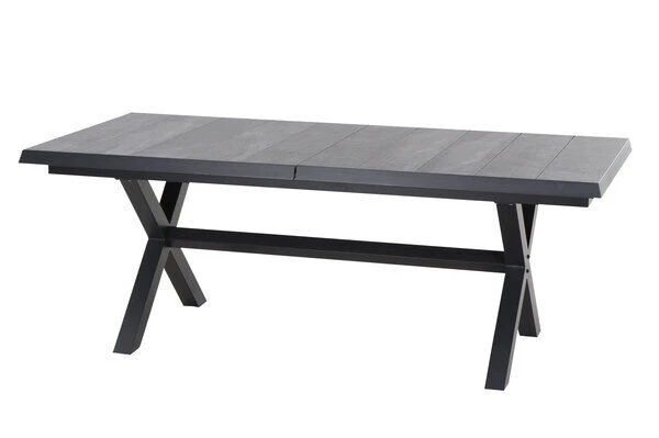 Wer das Besondere liebt ist mit diesem Esstisch bestens bedient. Der Tisch bietet mit seinen Maßen von ca. 200/260 x 100 x 77 cm Platz für ca. 8-10 Personen – so steht dem gemütlichen Mittagessen mit der Familie nichts mehr im Wege. Das Gestell wurde aus pulverbeschichtetem Aluminium hergestellt, was den Tisch besonders haltbar macht. Die Tischplatte besteht aus hochwertigem Keramik, während die Tischbeine für ein weiteres optisches Highlight sorgen. Durch die großzügige Unterschubhöhe kann man gemütlich mit vielen Arten von Sesseln an diesem Tisch Platz nehmen. Der Tisch ist durch das Eigengewicht von ca. 88 kg perfekt gegen Windstöße geschützt. Die Fußkappen bestehen aus Kunststoff und schützen den Boden vor unschönen Kratzern beim Verrücken des Möbelstücks.