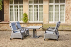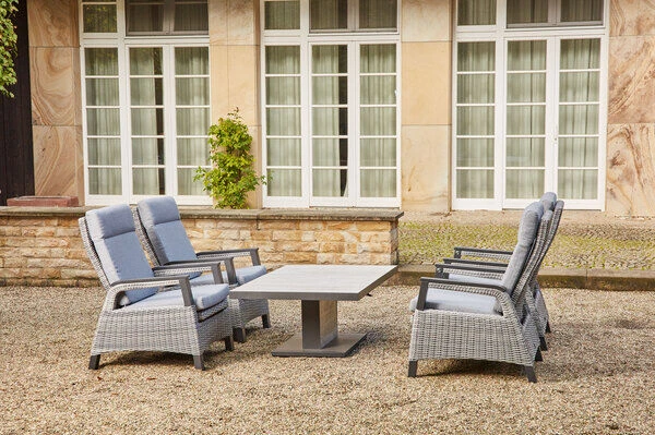 Gönnen Sie sich ein wenig Luxus in Ihrem Alltag und verbringen Sie in gepflegter Atmosphäre den Tag auf Ihrer Terrasse: bei einem leckeren Frühstück, bei einem genüsslichen Brunch oder lassen Sie bei einem Abendessen den Tag in geselliger Runde ausklingen. Das Dining Set, bestehend aus vier Sessel und dem Lifttisch Bellani, lädt Sie und Ihre Gäste jederzeit zum Zurücklehnen und Verweilen ein. Der bequeme Stoff der Rückenlehne ermöglicht ein müheloses Entspannen. Der Sessel hat ein Gesamtmaß von ca. 71 x 84 x 98 cm. Die ca. 57 cm breite Sitzfläche bietet genügend Platz. Mit einer großzügigen Sitztiefe von ca. 56 cm und bei einer Sitzhöhe von ca. 37 cm lässt es sich hier auch herrlich bei einem Nickerchen entschleunigen. Die praktischen Armlehnen in einer Höhe von ca. 62 cm bieten zusätzlichen Komfort und sind echte Hingucker. Passende Sitzpolster verleihen dem Sessel ein unvergleichliches Sitzerlebnis.