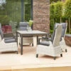 STERN Cardiff Esstischgruppe, silber, Edelstahl/Textilen/FSC-Teakholz, Ausziehtisch 162/220 x 90 cm, 6 Stapelsessel