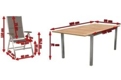 Bei dieser Esstischgruppe treffen besonders edle Materialien und zeitloses Design aufeinander. Das Set besteht aus einem Ausziehtisch der Marke OUTFLEXX mit den Maßen von ca. 150/200 x 90 x 75 cm und 6 Multipositionssesseln der Marke Stern aus der Serie „Cardiff“. Die hellen Farben des Gestells sind in Verbindung mit der Farbe des Teakholzes ein echter Hingucker und sorgen für eine zeitlose Frische. Dadurch lässt sich die Esstischgruppe wunderbar mit anderen Farben kombinieren. So bleibt Ihnen viel Raum für kreative Gestaltungsmöglichkeiten. Die hochwertigen Materialien und die sorgfältige Verarbeitung sorgen nicht nur für die besondere Optik dieser Esstischgruppe, sondern machen sie auch sehr stabil.