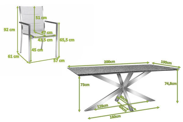An dieser tollen Tafel speisen Sie ganz gepflegt auf Granit. Mit MaĂen von ca. 200 x 100 x 74,8 cm und einer Tischunterkantenhöhe von ca. 73 cm bietet der Esstisch von OUTFLEXXÂź ausreichend Platz fĂŒr 6-8 Personen. Seine besondere Optik verdankt der Tisch seinem exklusiven sternförmigen Gestell und einer Tischplatte aus einzigartigem Granit. Die OberflĂ€che der ca. 1,8 cm starken Platte in der Farbe „perlgrau matt“ ist versiegelt und bietet Ihnen die Möglichkeit auch warme Speisen direkt darauf abzustellen. Getragen wird die Granitplatte von einem modernen Edelstahlgestell im natĂŒrlichen, kĂŒhl-glĂ€nzenden Silberton. Der mĂ€chtige Tisch bringt insgesamt ca. 132 kg auf die Waage ohne an Eleganz einzubĂŒĂen: das Tischgestell wiegt ca. 12 kg und die passende Tischplatte ca. 120 kg. Der Esstisch ist Ă€uĂerst stabil und kann bis zu ca. 150 kg Gewicht tragen. Seine belastbaren ca. 7,5 x 4,5 cm dicken Tischbeine haben lĂ€ngs einen Abstand von ca. 128 cm. Das harmonische Zusammenspiel der designstarken TischoberflĂ€che und des stylischen X-Gestells verleiht dem Esstisch sein unnachahmliches Aussehen: machen Sie diesen exklusiven Tisch zum KernstĂŒck Ihres Outdoorbereiches.