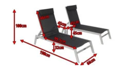 Dieses schicke und zeitlose Gartenliegenset von Villana bereichert jeden Garten, Balkon, Spa-Bereich oder jede Terrasse. Es besteht aus zwei Gartenliegen und einen praktischen Beistelltisch. Die Liegen sind mehrfach verstellbar, sodass man für sein Wohlgefühl die richtige Einstellung wählen kann. Jede Liege verfügt über ein hochwertiges, silberfarben pulverbeschichtetes Aluminiumgestell, auf welches ein formstabiles Textil-Gewebe 2×1 (70% Polyvinylchlorid / 30% Polyester) in Schwarz aufgespannt wurde. Die maximale Belastbarkeit der Liegen liegt bei je ca. 160 kg. Der Beistelltisch (ca. 45 x 45 cm) bietet die perfekte Ergänzung zu den Liegen, zum Beispiel als Ablage für die Zeitung oder ein gutes Buch, die Sonnen- oder Lesebrille oder etwas Leckeres zwischendurch. Das Gestell des Tisches ist ebenfalls aus pulverbeschichtetem Aluminium in Silber gefertigt, die ca. 5 mm dicke Tischplatte aus Sicherheitsglas ist weiß. Die Fußkappen der Möbel sind aus silbernem Kunststoff und schützen den Boden vor unschönen Kratzern beim Verrücken des Stuhles, die silbernen Schrauben aus galvanisiertem Stahl runden die Optik perfekt ab. Mit einem Gewicht von nur ca. 8,1 kg und Maßen von ca. 198 x 66 x 32 cm fügen sich die Liegen perfekt in Ihren Garten ein und lassen sich zusätzlich auch leicht hin und her stellen. Jetzt noch ein gutes Buch dazu und schon wird jede Minute in Ihrem Garten zur puren Entspannung.
