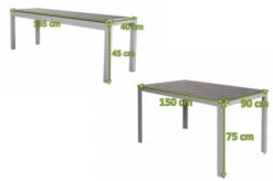 Ganz gleich, was Sie vorhaben – ob ein gemeinsames Kaffeekränzchen, ein Brunch, ein Abendessen oder auch ein gemütlicher Spieleabend – der elegante, rechteckige Tisch bietet Ihnen immer das passende Ambiente. Mit seiner Größe von ca. 150 x 90 x 75 cm haben Sie ausreichend Platz für bis zu 6 Personen. Das Tischgestell aus pulverbeschichtetem Aluminium gibt dem Tisch eine besonders hohe Stabilität und dank seines Gewichtes von ca. 18,7 kg ist der Tisch auch bis ca. 50 kg belastbar. Die Tischbeine haben längs einen Abstand von ca. 143 cm und die Höhe bis zur Tischunterkante beträgt ca. 68 cm. Für die ca. 2 cm starke schwarze Tischplatte wird das moderne Material aus Kunststoff-Holzimitat verwendet. Das Zusammenspiel aus der Oberfläche in Holzoptik und dem edlen Untergestell aus stabilem Aluminium verleiht dem Tisch sein besonderes Aussehen. An dieser Tafel sitzen Sie nicht nur bequem, sondern mit Stil. Hier wird jedes gemütliche Beisammensein zu etwas Besonderem. Überzeugen Sie sich von der Leichtigkeit der verwendeten Materialien und dem modernen Design des Tisches. Mit den hochwertigen Materialien ist dieser Tisch nicht nur pflegeleicht, sondern auch witterungsbeständig: Trotzen Sie Sonne, Wind und Wasser! Das Gestell aus Aluminium in der Trendfarbe silber ist aufgrund der Pulverbeschichtung widerstandsfähig gegen jegliche Umwelteinflüsse.
